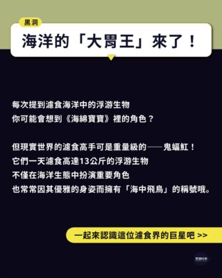 每次談到濾食海洋中的浮游生物,你可能會想到《海綿寶寶》裡的某些角色,但你知道嗎?真實世界裡的濾食達人可是「重量級」選手——鬼蝠魟!它們一天濾食高達13公斤的浮游生物,不僅在海洋生態中扮演重要角色,也常常因其優雅的身姿而被譽為「海中飛鳥」。今天,就讓我們來認識這位濾食界的巨星吧!