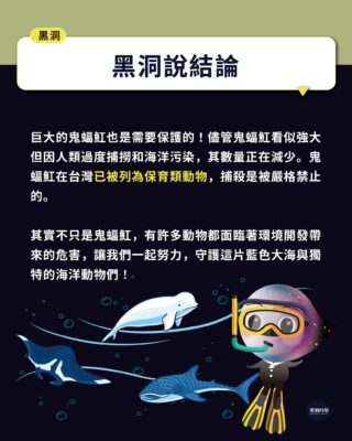 其實不只是鬼蝠魟,許多動物都面臨著人類活動帶來的危害,讓我們一起努力,守護這片藍色大海與獨特的海洋動物們!