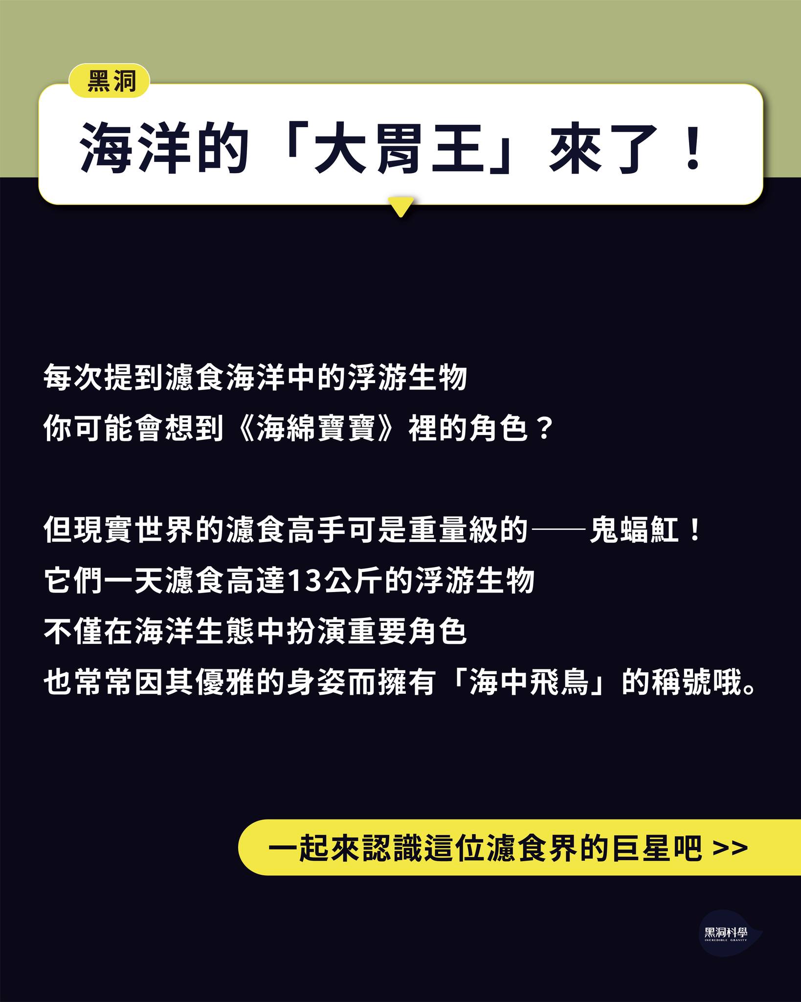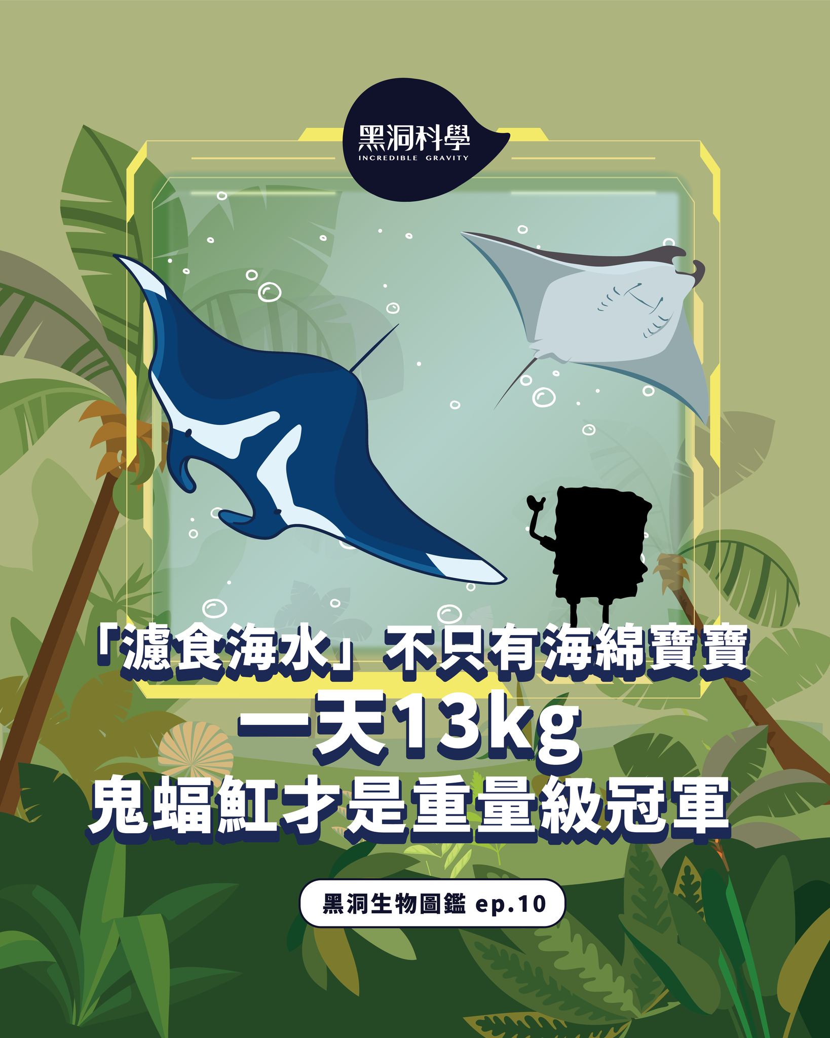 每次談到濾食海洋中的浮游生物,你可能會想到《海綿寶寶》裡的某些角色,但你知道嗎?真實世界裡的濾食達人可是「重量級」選手——鬼蝠魟!它們一天濾食高達13公斤的浮游生物,不僅在海洋生態中扮演重要角色,也常常因其優雅的身姿而被譽為「海中飛鳥」。今天,就讓我們來認識這位濾食界的巨星吧!