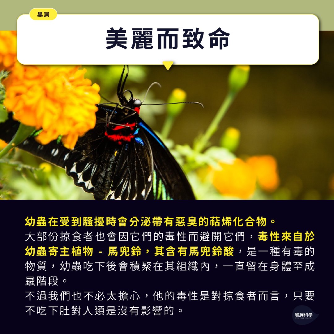 大部份掠食者也會因它們的毒性而避開它們,毒性來自於幼蟲寄主植物-馬兜鈴,其含有馬兜鈴酸,