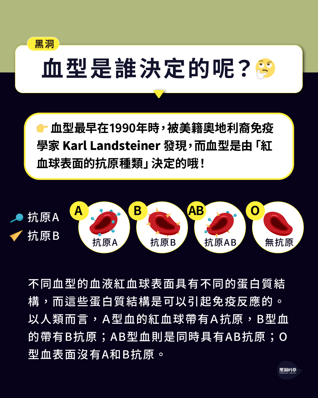 血型最早在1990年時,被美籍奥地利裔免疫學家 Karl Landsteiner發現,而血型是由紅血球表面的抗原種類決定的。抗原的定義是可以引起免疫反應的結構,因此,簡單來說,不同血型的血液紅血球表面具有不同的蛋白質結構,而這些蛋白質結構是可以引起免疫反應的。以人類而言,A型血的紅血球帶有A抗原,B型血的帶有B抗原;AB型血則是同時具有AB抗原;O型血表面沒有A和B抗原。