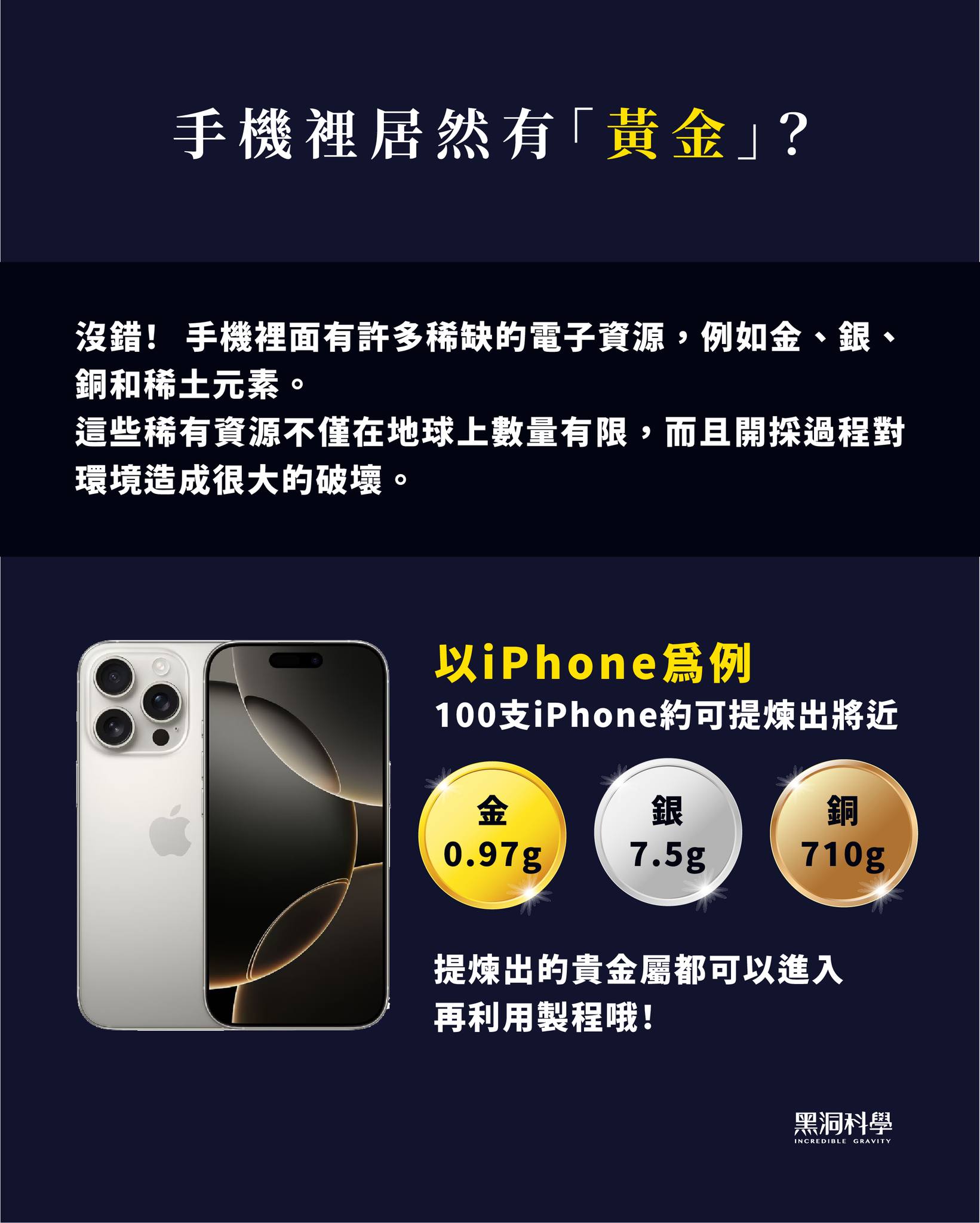 以iPhone為例100支iPhone約可提煉出將近0.97克的金、7.5克的銀、710克的銅,提煉出的貴金屬都可以進入再利用製程。