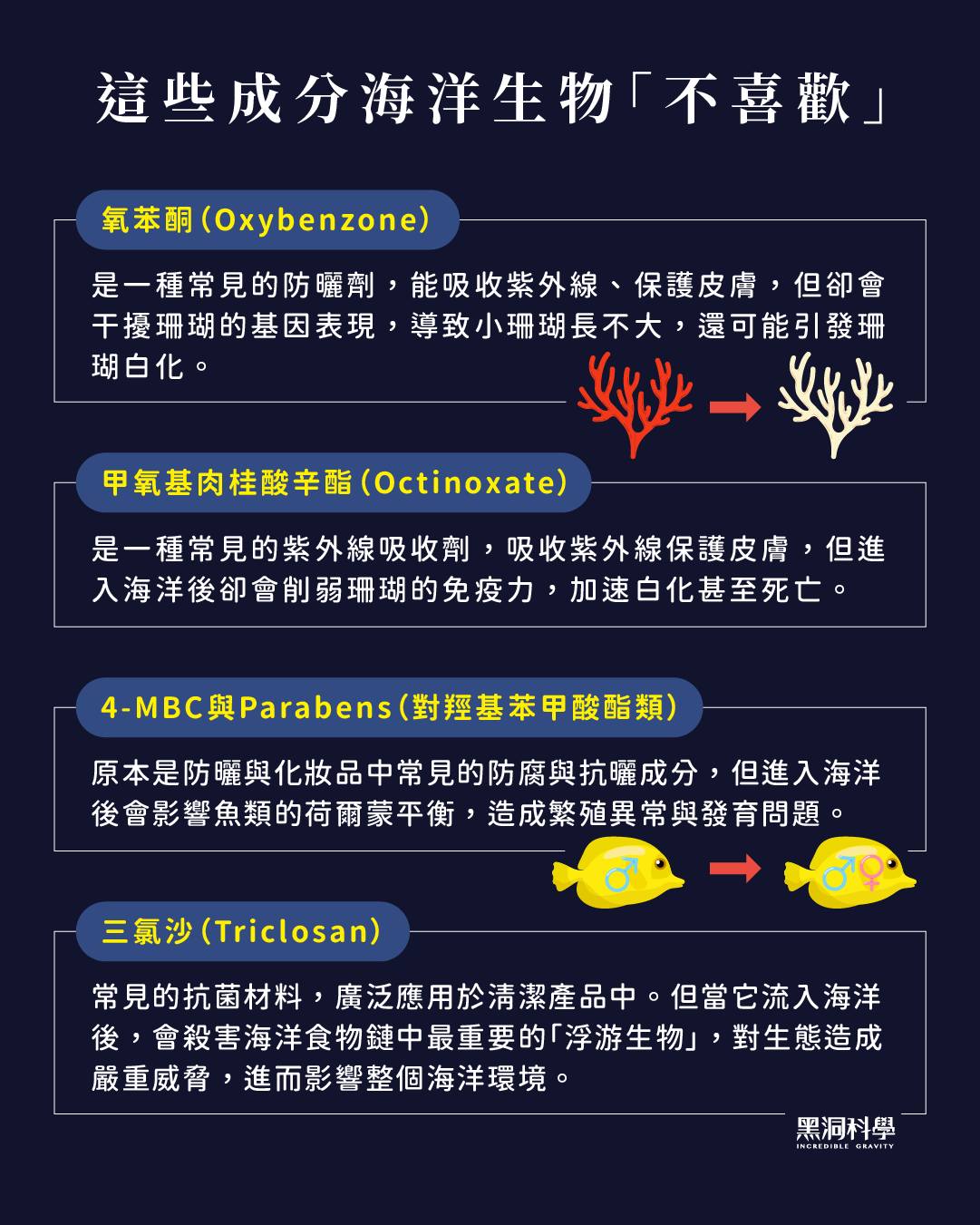 原本是防曬與化妝品中常見的防腐與抗曬成分,但進入海洋後會影響魚類的荷爾蒙平衡,造成繁殖異常與發育問題。