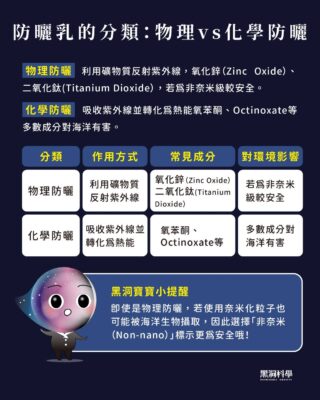 物理防曬 利用礦物質反射紫外線 氧化鋅(Zinc Oxide)、二氧化鈦(Titanium Dioxide) 若為非奈米級較安全。