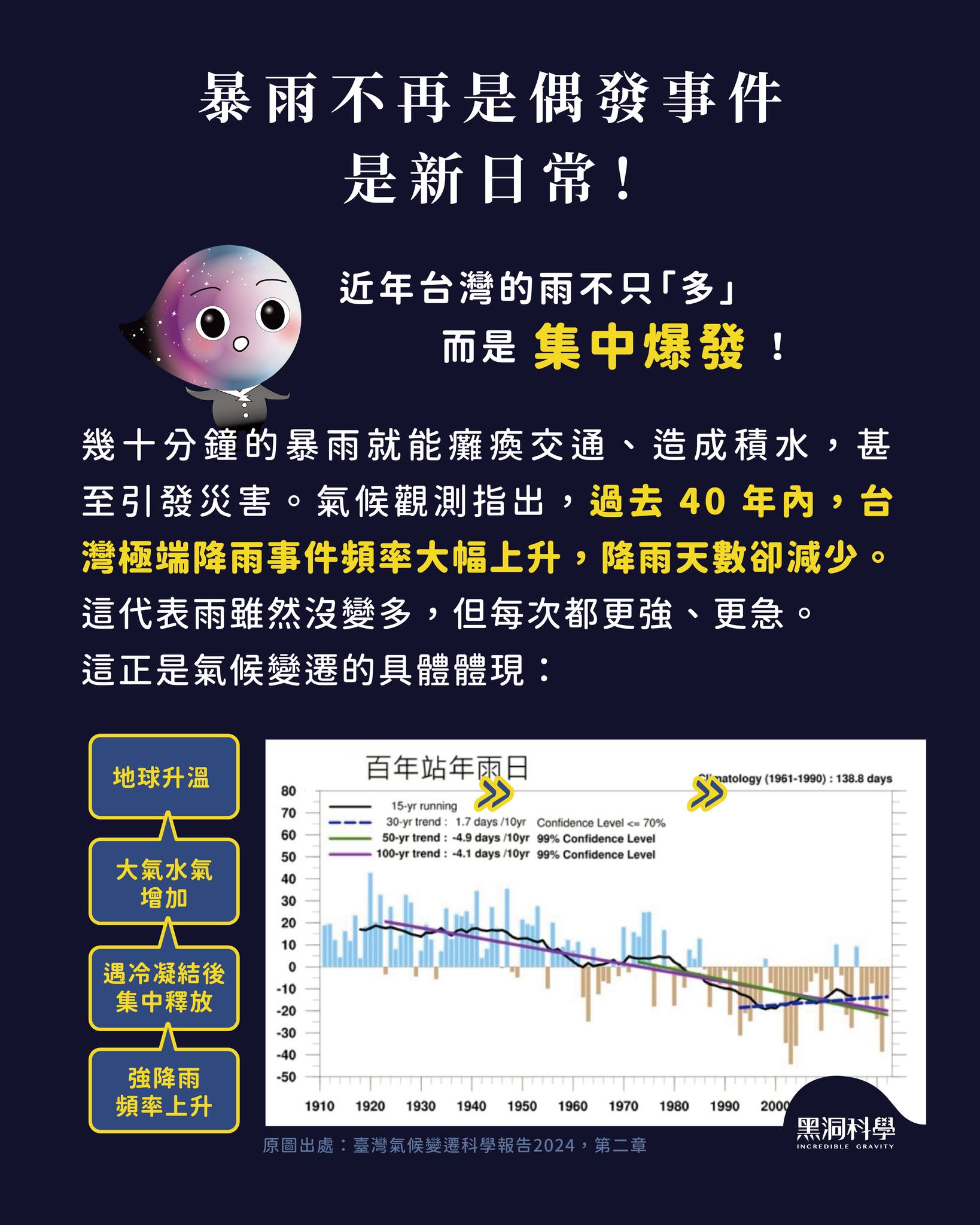 氣候觀測指出,過去 40 年內,台灣極端降雨事件的發生頻率大幅上升,降雨天數反而減少。這代表雨雖然沒變多,但每次都更強、更急。