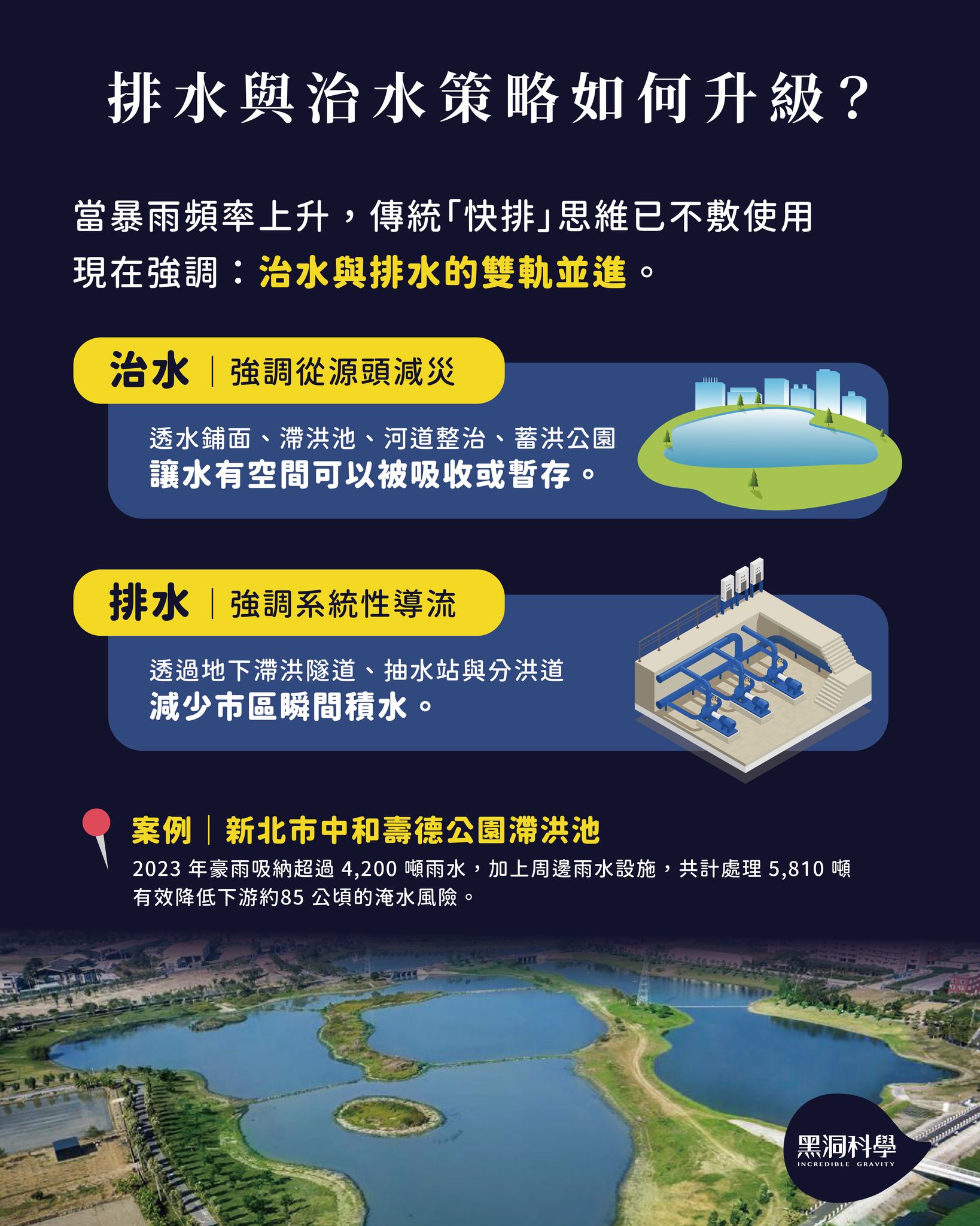 像新北市的滯洪池、台南的鹽水防洪公園、以及東京的「地底防洪大廳」都是生活案例。