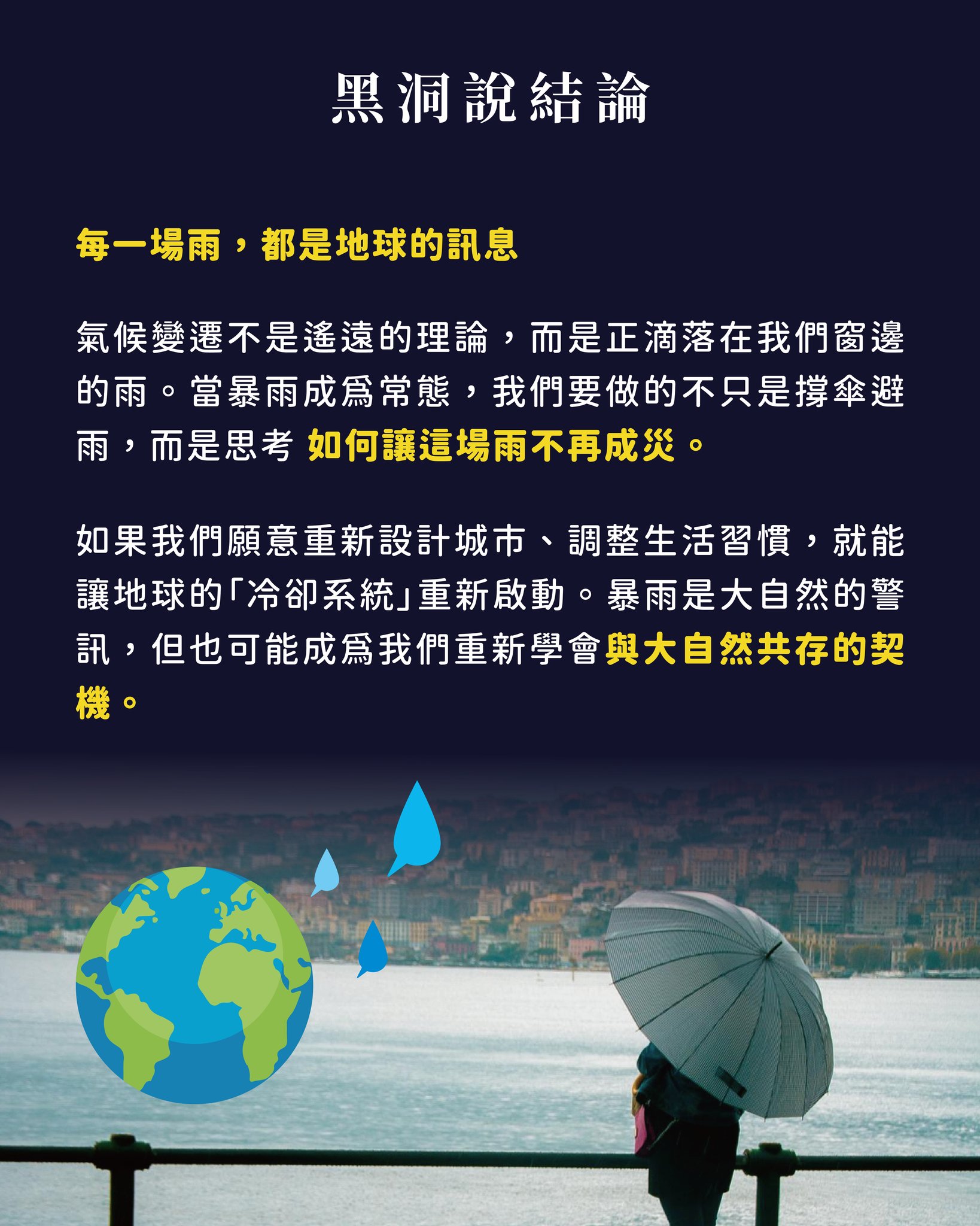 氣候變遷不是遙遠的科學理論,而是正滴落在我們窗邊的雨。當暴雨變成「常態」,我們要做的不只是撐傘避雨,而是思考如何讓這場雨不再成災。