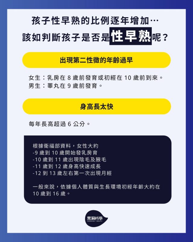 女生:乳房在8歲前發育或初經在10歲前到來。