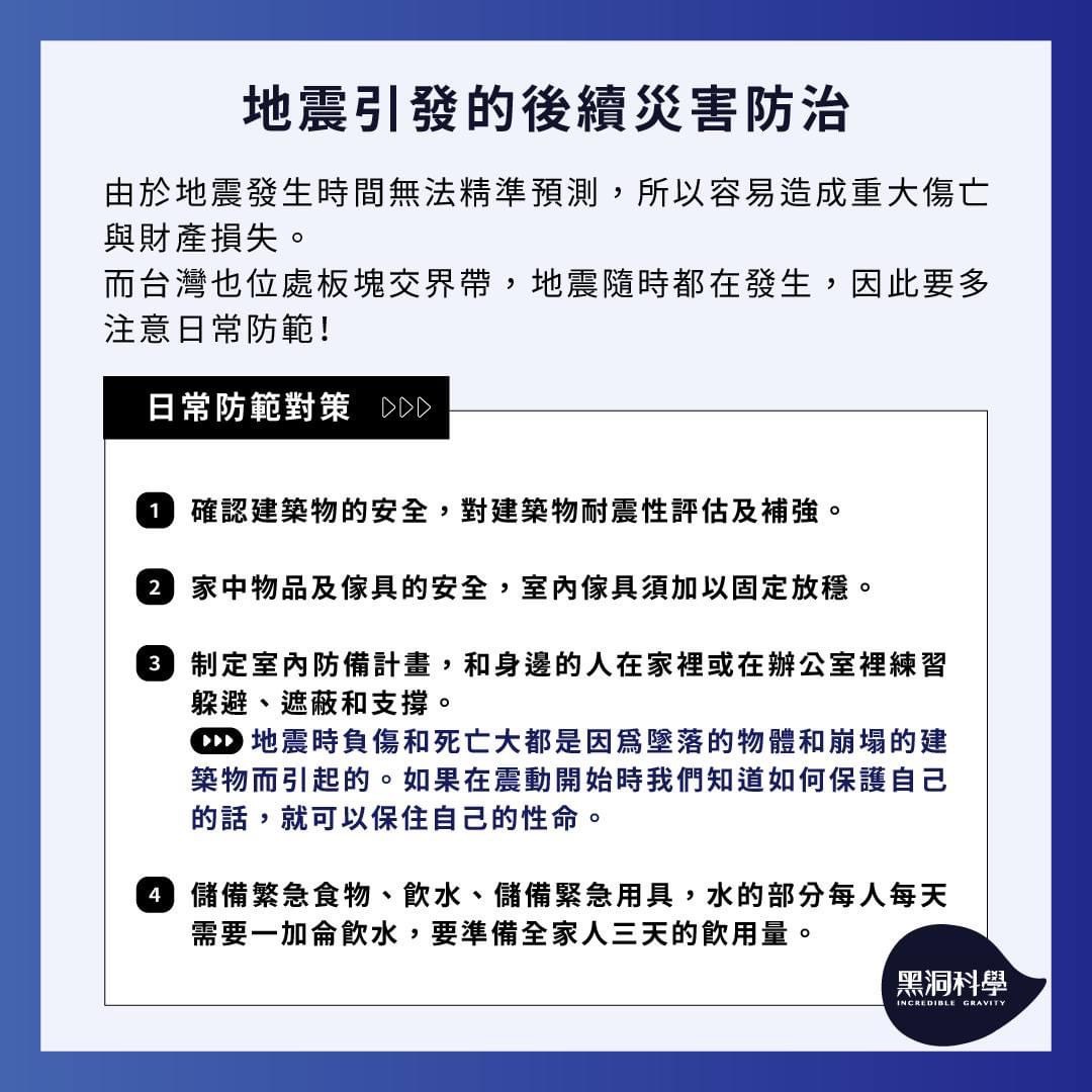 台灣也身處在板塊交界帶,地震隨時都有可能發生,因此日常的防範更加重要,