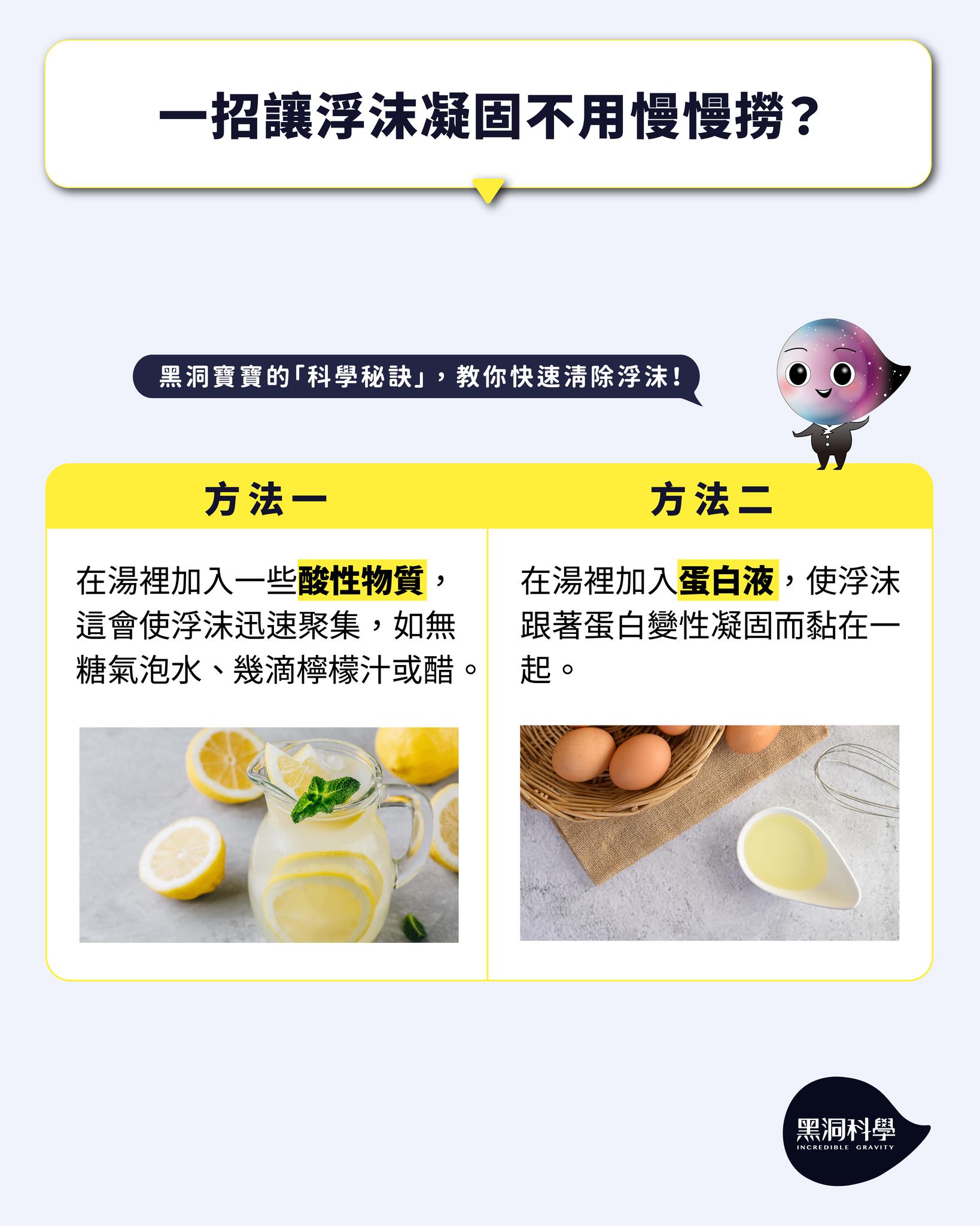 想要快速清除浮沫,還真有一個“科學秘訣”可以在湯裡加入一些酸性物質,如無糖氣泡水、幾滴檸檬汁或醋,這會使浮沫迅速聚集,方便一舉撈出。還有一個方法是加入蛋白液使浮沫跟著蛋白變性凝固而黏再一起,一樣可以方便撈出,但這些方法多少會影響湯的味道,若是在意湯的風味,還是只能用傳統的方式撈浮沫了。