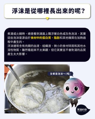 煮湯或火鍋時湯面上出現的白色或灰色泡沫,這些泡沫主要是食材中的蛋白質、脂肪和其他雜質在加熱過程中產生的。當食物中的蛋白質遇熱變性,與水中的氣泡形成小泡沫並上浮,這些浮沫通常含有肉類的血液、組織液、微小的食材碎屑和其他水溶性物質。雖然看起來不太美觀,但它其實是烹調過程中食材正常的化學變化,並不會對湯的品質產生太大影響。