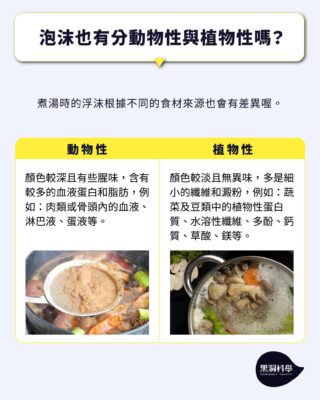 - 動物性食材如肉類或骨頭,浮沫中含有較多的血液蛋白和脂肪,因此顏色較深且有些腥味