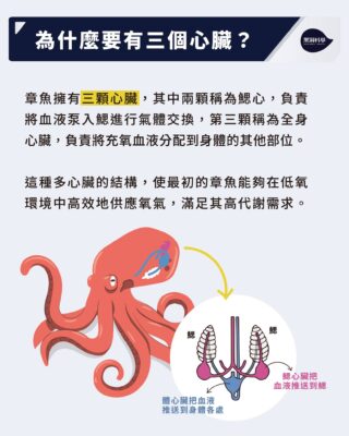 章魚擁有三顆心臟,其中兩顆稱為鰓心,負責將血液泵入鰓進行氣體交換,第三顆稱為全身心臟,負責將充氧血液分配到身體的其他部位。