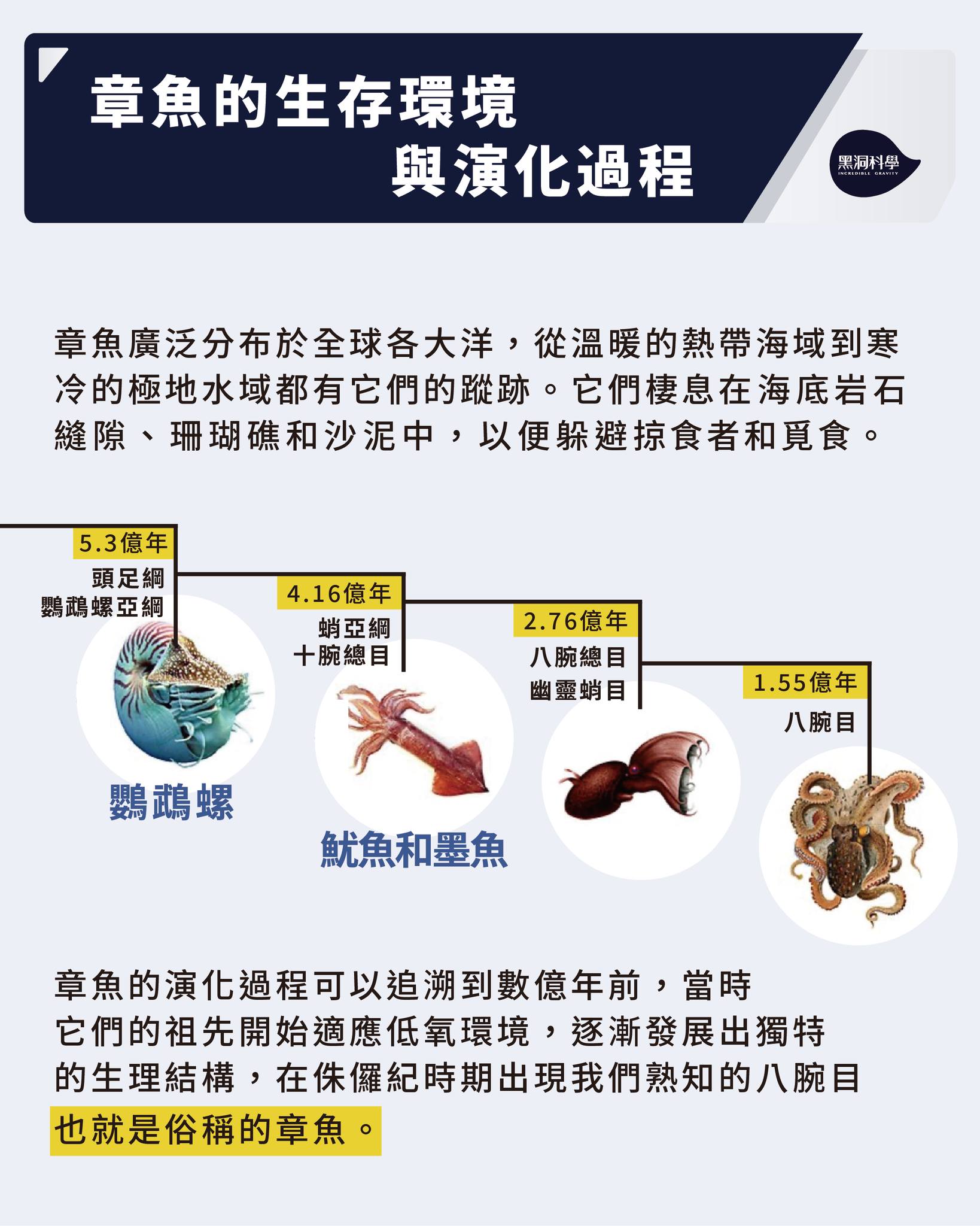 章魚廣泛分布於全球各大洋中,從溫暖的熱帶海域到寒冷的極地水域都能找到它們的蹤跡。它們通常棲息在海底的岩石縫隙、珊瑚礁和沙泥中,以便躲避掠食者和尋找食物。章魚的演化過程可以追溯到數億年前,當時它們的祖先開始適應低氧環境,逐漸發展出獨特的生理結構,在侏儸紀時期出現我們熟知的八腕目也就是俗稱的章魚。