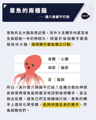 章魚的主大腦負責記憶,另外8支觸手內甚至全身有超過一半的神經元,相當於每個觸手都是個迷你大腦,每條觸手都能獨立行動。