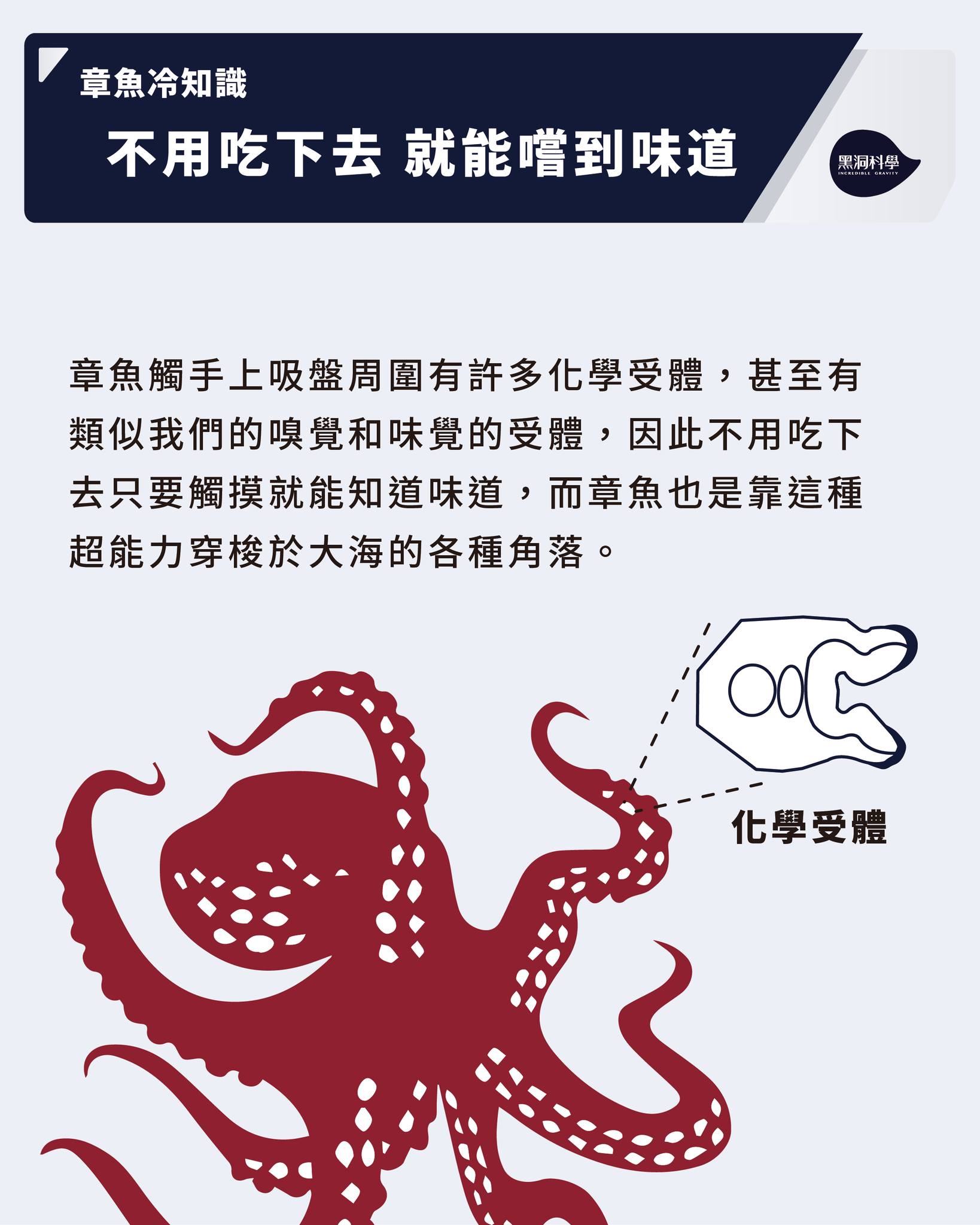 章魚觸手上吸盤周圍有許多化學受體,甚至有類似我們的嗅覺和味覺的受體,因此不用吃下去只要觸摸就能知道味道,而章魚也是靠帳種超能力穿梭於大海的各種角落。