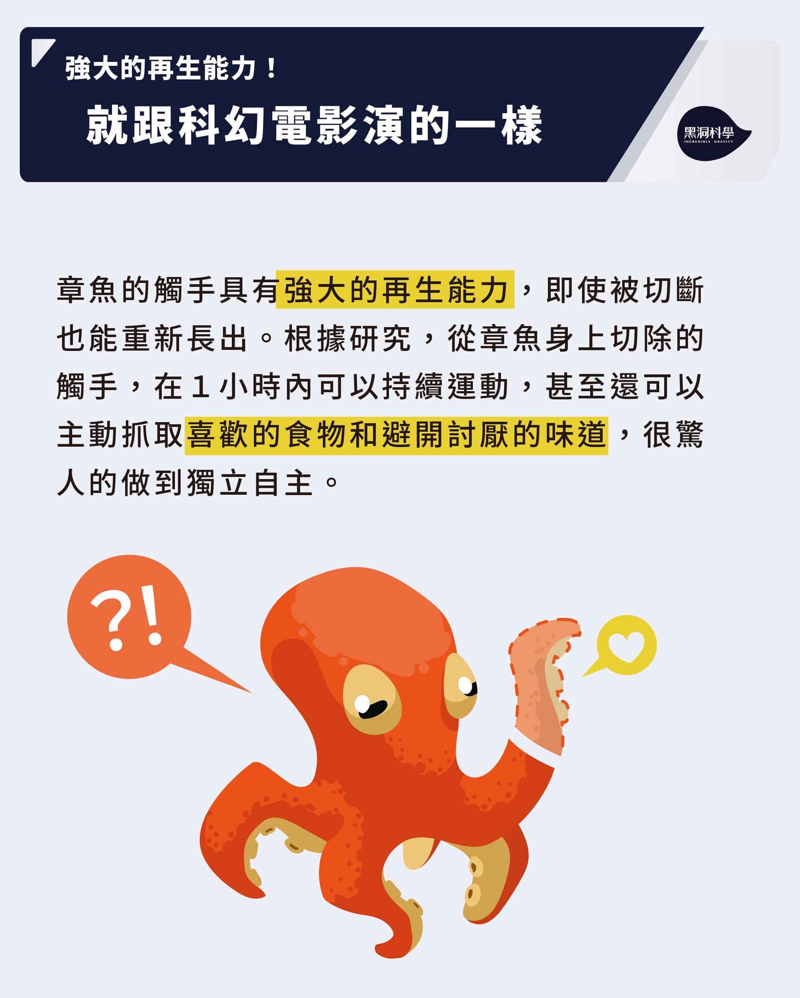 章魚的觸手具有強大的再生能力,即使被切斷也能重新長出。根據研究,從章魚身上切除的觸手,在1小時內可以持續運動,甚至還可以主動抓取喜歡的食物和避開討厭的味道,很驚人的做到獨立自主。