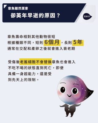 章魚壽命相對其他動物很短,根據種類不同,短則6個月,長則5年,通常在交配和產卵之後就會進入衰老期。