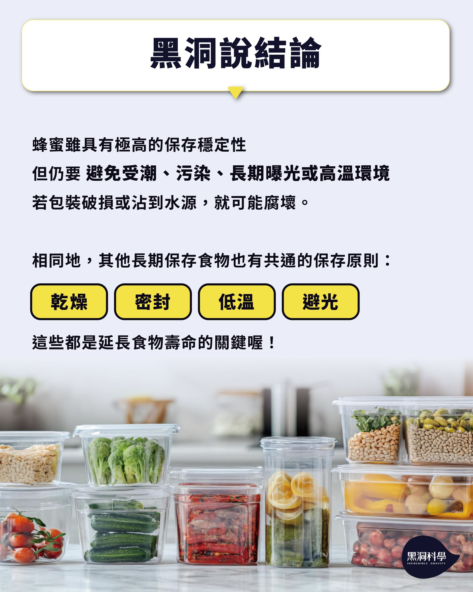 蜂蜜雖具有極高的保存穩定性但仍要 避免受潮、污染、長期曝光或高溫環境若包裝破損或沾到水源,就可能腐壞。