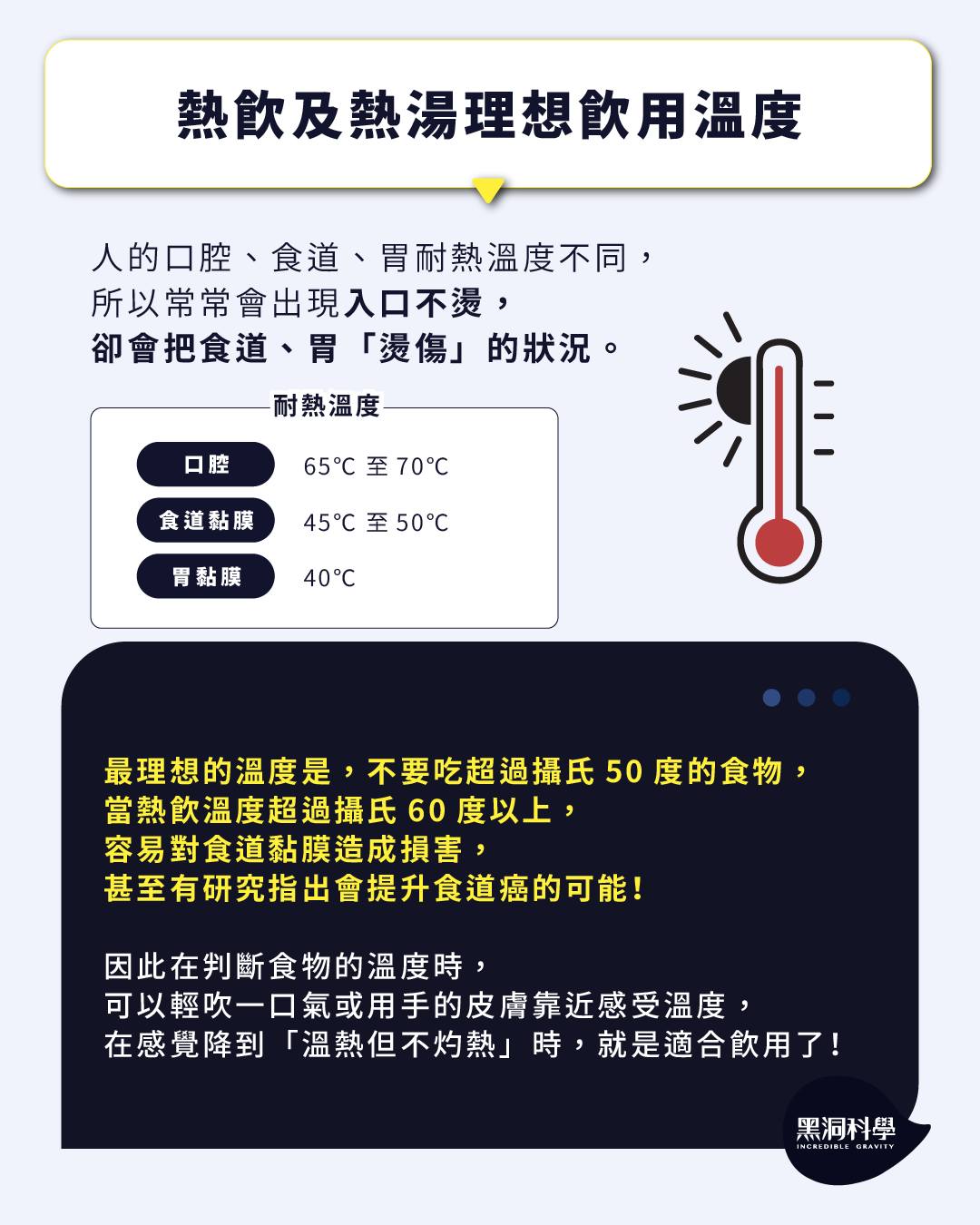 最理想的溫度是,不要吃超過攝氏50度的食物,當熱飲溫度超過攝氏60度以上,容易對食道黏膜造成損害,甚至有研究指出會提升食道癌的可能!