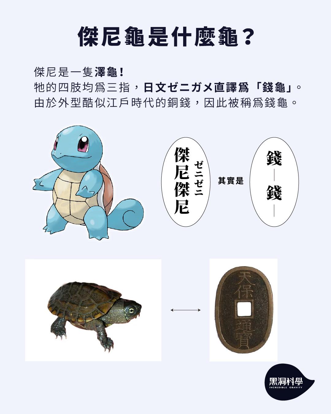 牠的四肢均爲三指,日文ゼニガメ直譯為「錢龜」。由於外型酷江戶時代的銅錢,因此被稱為錢龜。