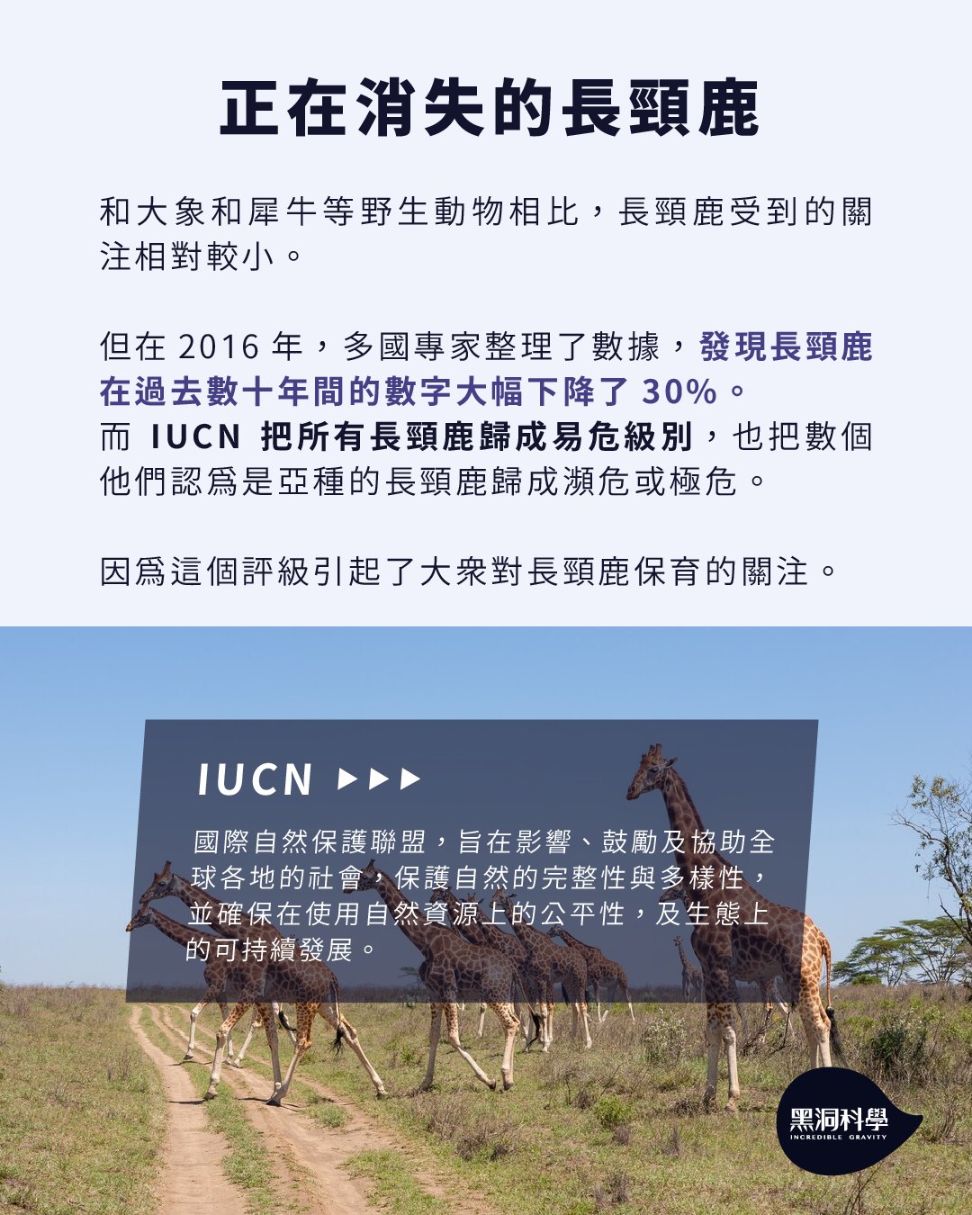 但在2016年,多國專家整理了數據,發現長頸鹿在過去數十年間的數字大幅下降了30%。而 IUCN 把所有長頸鹿歸成易危級別,也把數個他們認為是亞種的長頸鹿歸成瀕危或極危。