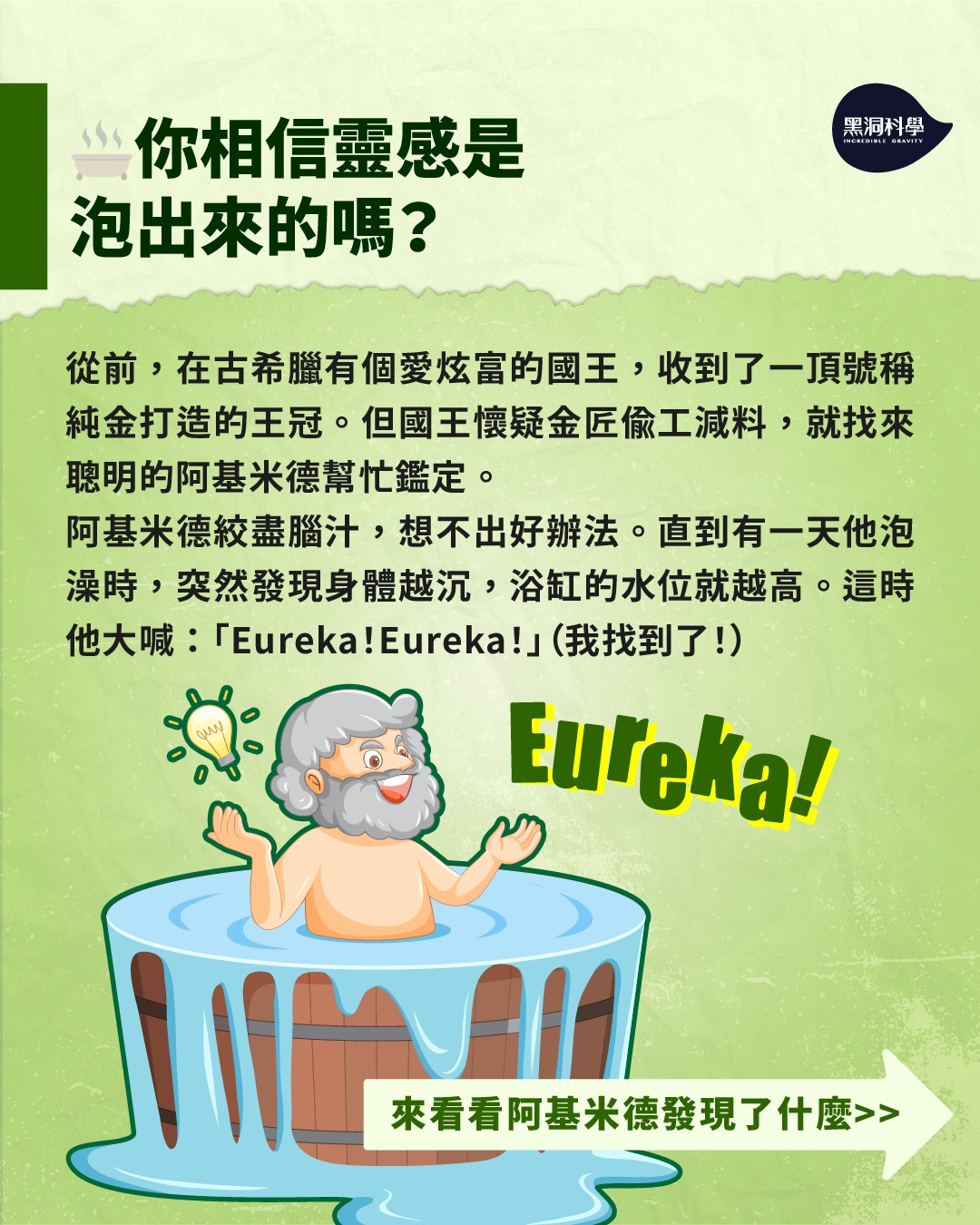 阿基米德絞盡腦汁,想不出好辦法。直到有一天,他泡澡時,突然發現身體越沉,浴缸的水位就越高。這時,他大喊:「Eureka!Eureka!」(我找到了!)