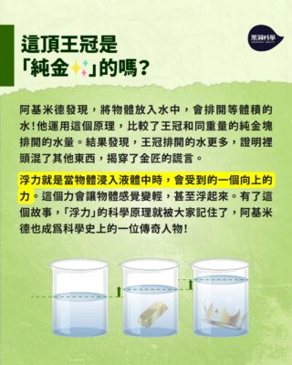浮力就是當物體浸入液體中時,會受到一個向上的力。這個力會讓物體感覺變輕,甚至浮起來。有了這個故事,「浮力」的科學原理就被大家記住了,而阿基米德也成為科學史上的一位傳奇人物!