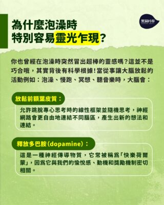 你是否也曾有過這樣的經驗:在泡澡時,原本想不通的問題突然豁然開朗,或是靈感如泉湧般不斷冒出?這並不是巧合,背後其實有科學根據!