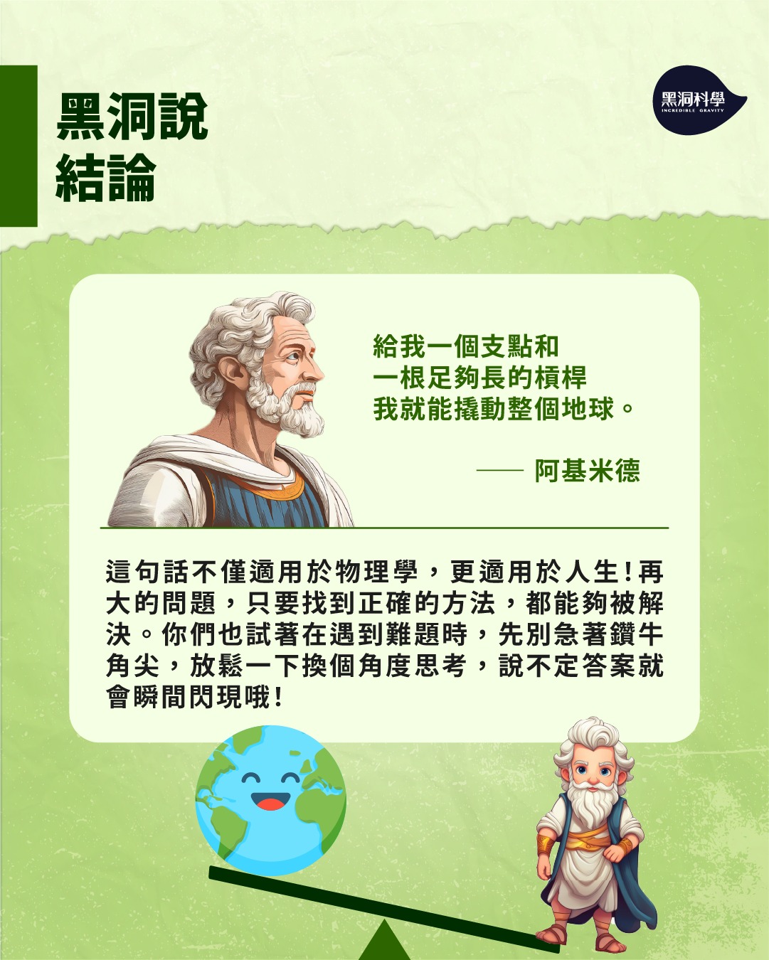 這句話不僅適用於物理學,更適用於人生!再大的問題,只要找到正確的方法,都能能夠被解決。你們也試著在遇到難題時,先別急著鑽牛角尖,放松一下換個角度思考,說不定答案就會瞬間閃現哦!